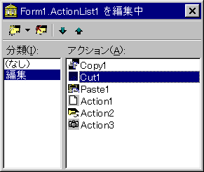 まず、アクションリストの編集ウインドウで項目を作成します。 Imagesプロパティでイメージリストを設定しておけば、アイコンが表示されます。 |
