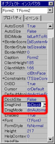 ドッキングしたいコントロール(ToolBar、Form2)では、DragKindをdkDock、DragModeをdmAutomaticにします。DockSiteをTrueにすれば、そのコントロール自身が他のコントロールを受け入れることもできます。 |