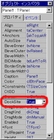 まず、ドッキングを受け入れる側(例ではControlBarとPanel)のDockSiteプロパティをTrueにします。 受け入れ側はこれだけです。 |