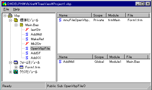 左側のツリー表示の部分はプロジェクトの全体構造を表しています。 プロジェクト→モジュール種別→モジュールファイル→関数 という具合に、階層表示されます。 右側のリスト部分は、ツリーで選択された関数の依存関係で、上が他関数から自関数の参照、下が自関数から他関数への参照を表しています。 リスト部分をダブルクリックすると、その関数のコードを表示させることもできます。