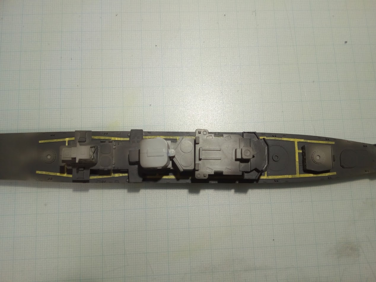 戦闘甲板と呼ばれる、人の通り道は滑り止め加工がされていて暗めの配色となっているので、細切りマスキングテープでぶり分けます。