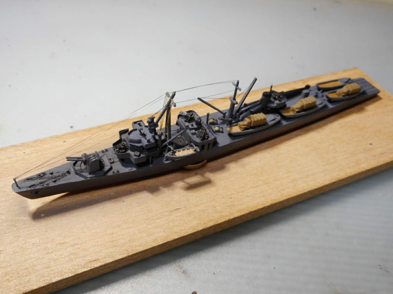 マストから真下に垂れてるものは信号旗を上げるためのもです。こちらは茶色目の伸ばしランナーを使いました。また前後に延びる無線索は0.15号のメタルリギングを使用しています。